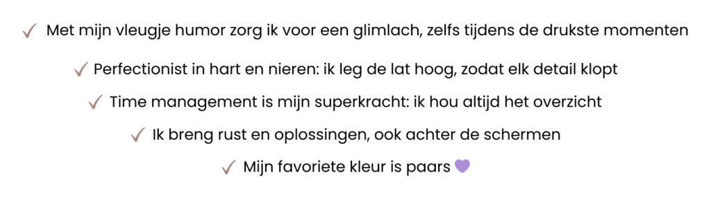 Terwijl ik receptiezalen bezocht, leveranciers contacteerde en elk detail vorm gaf, ontdekte ik hoeveel plezier ik haalde uit het samenbrengen van al die puzzelstukken tot één kloppend geheel. Ondanks de stress en uitdagingen, voelde ik dat dit méér was dan zomaar een taak. Het was de start van mijn roeping. Mijn familie bevestigde wat ik diep vanbinnen al wist: ik ben een geboren organisator.